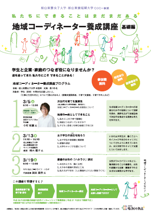 松山東雲女子大学・松山東雲短期大学COC+事業私たちにできることはまだまだある 地域コーディネーター養成講座<基礎編>が始まります!これからの若者のライフプランを考える際に重要なことは、「仕事と生活の両立」です。 それをいかに支援し、地元企業に定着し続けられるような環境整備をするかが、今求められてい...