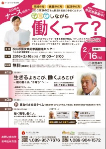 えひめのナースの方への講演会!★現役の方 ★休職中の方 ★就活中の方 ★そのご家族の方! ランチ座談会に引き続き、2月16日(火)「ナースマッチえひめ(http://nurse-ehime.com/)」さんとのコラボでイベントを行います!みなさんが必ず悩むのが「仕事と家庭の両立」です。どちらも...